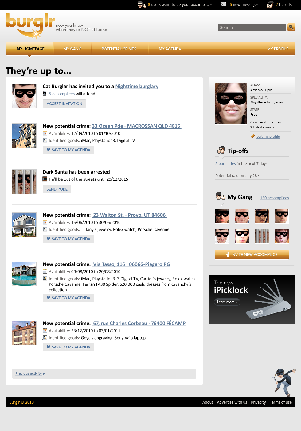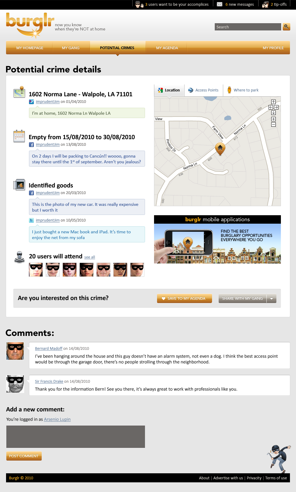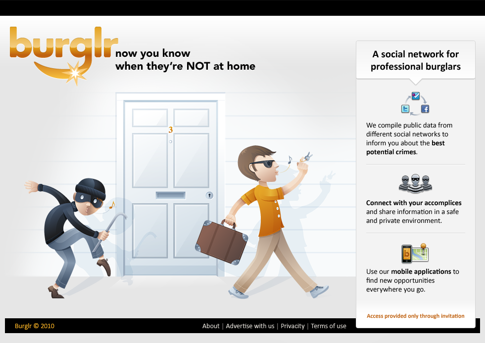 Burglr is a fake social network that compiles public data to inform burglars about potential crimes.